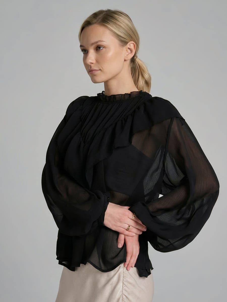Стильная чёрная блузка — воплощение элегантности, которое органично впишется в самые разные образы. Прозрачная лёгкая ткань придаёт модели утончённый и загадочный шарм: она мягко струится при движении, создавая эффект воздушности и лёгкости, идеально подходящий для весны и лета. Изысканный воротник с рюшами добавляет романтичности и деликатно подчёркивает линию шеи, а воланы V‑образной формы на груди и спине создают выразительный акцент, придавая силуэту женственные очертания.