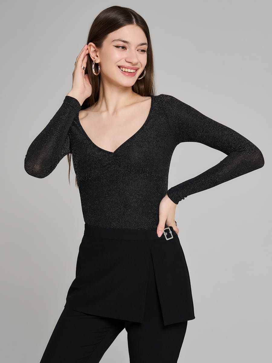 Изысканная праздничная блузка от бренда ТВОЕ — воплощение элегантности и женственности в современной моде 2025 года! Сочетание благородного блеска люрекса и утончённого дизайна создаёт неповторимый образ для особых случаев. Дизайн модели привлекает внимание продуманными деталями: V-образный вырез подчёркивает декольте, а изящная драпировка на груди добавляет образу очарования. Приталенный силуэт и облегающий крой создают безупречный силуэт.