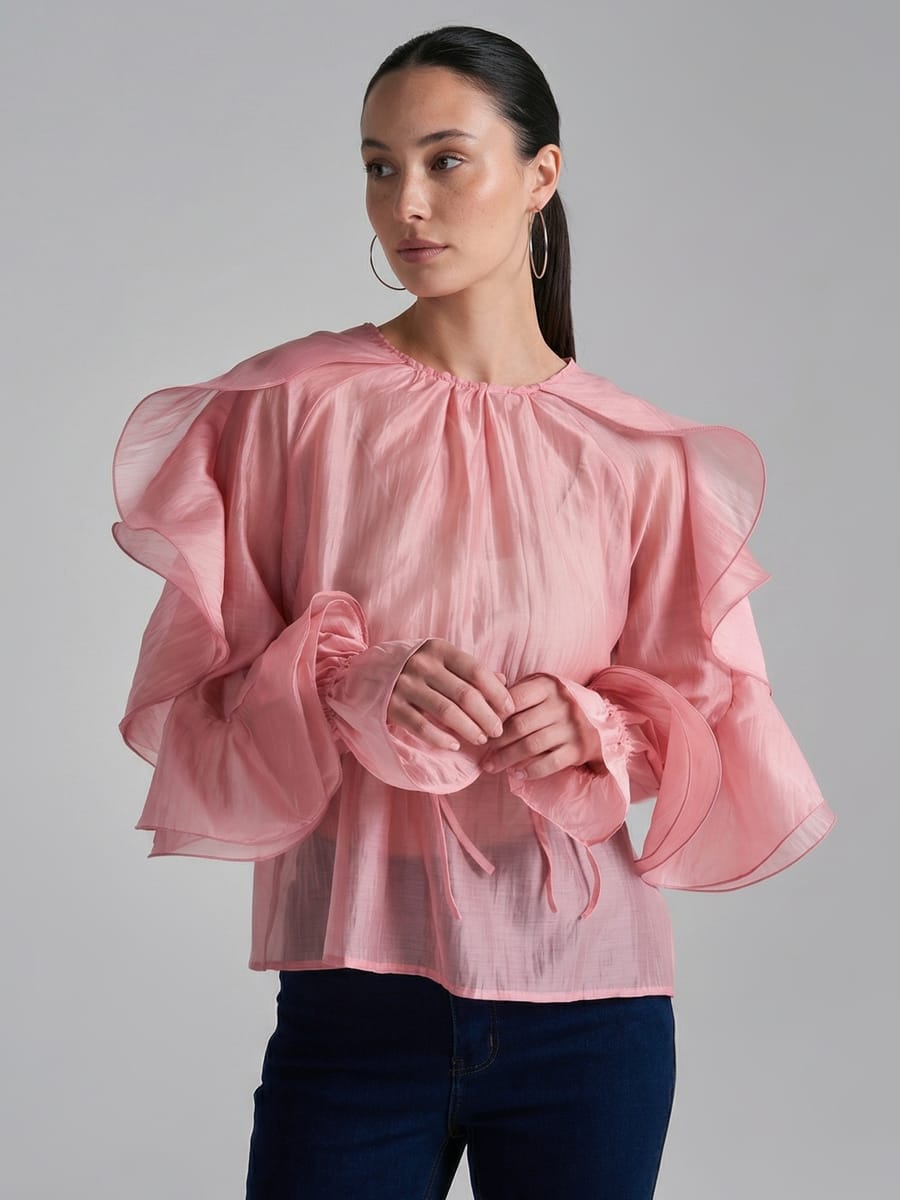 Лёгкая и воздушная розовая блузка — идеальный выбор для создания нарядных и повседневных образов весной и летом. Модель сочетает в себе элегантность вечерней одежды и непринуждённость летнего стиля: она подойдёт и для праздничной фотосессии, и для пляжного лука, и для повседневных выходов. Длинные рукава с воланами добавляют модели изысканности, а клёш на конце рукава с завязками на запястье позволяет регулировать посадку и подчёркивает женственность образа. Особый шарм придаёт чёрный бант на спине — лаконичный, но выразительный акцент, который завязывается и задаёт настроение всему ансамблю. Круглый вырез горловины дополняет общий силуэт, сохраняя баланс между нарядностью и сдержанностью.