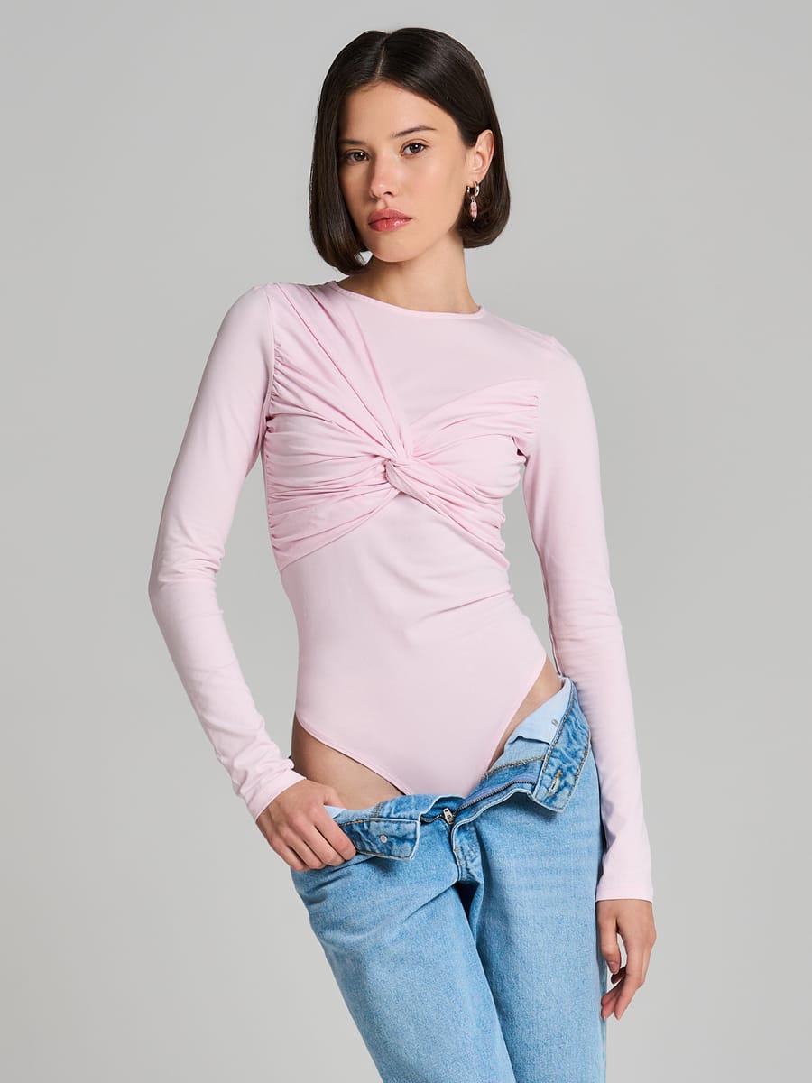 Эта женская боди-блузка прекрасно сочетает в себе элегантность и комфорт. Изготовленная из мягкого, дышащего хлопка, она обеспечивает наибольший комфорт в течение всего дня. Уникальная деталь дизайна - изящная драпировка на груди, которая добавляет изысканный штрих к общему виду.