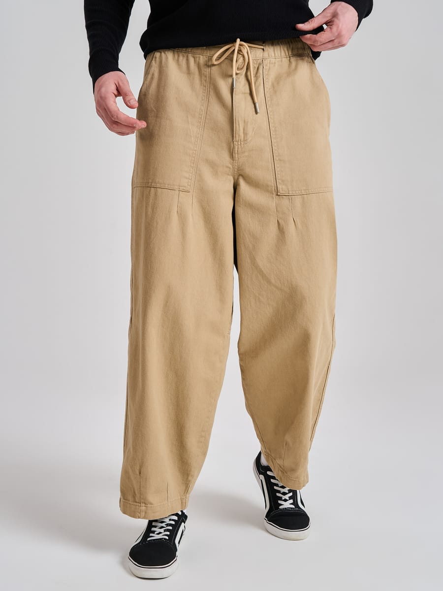 Мужские брюки от ТВОЕ 2026 — стильная модель в стиле сафари: широкие, свободного кроя, из 100 % хлопка. С большими накладными карманами спереди и сзади, резинкой с кулиской на талии, застёжкой на молнию и пуговицы. Подходят для офиса, прогулок и повседневного ношения. Модные и удобные — идеальный выбор для мужчин и подростков!
