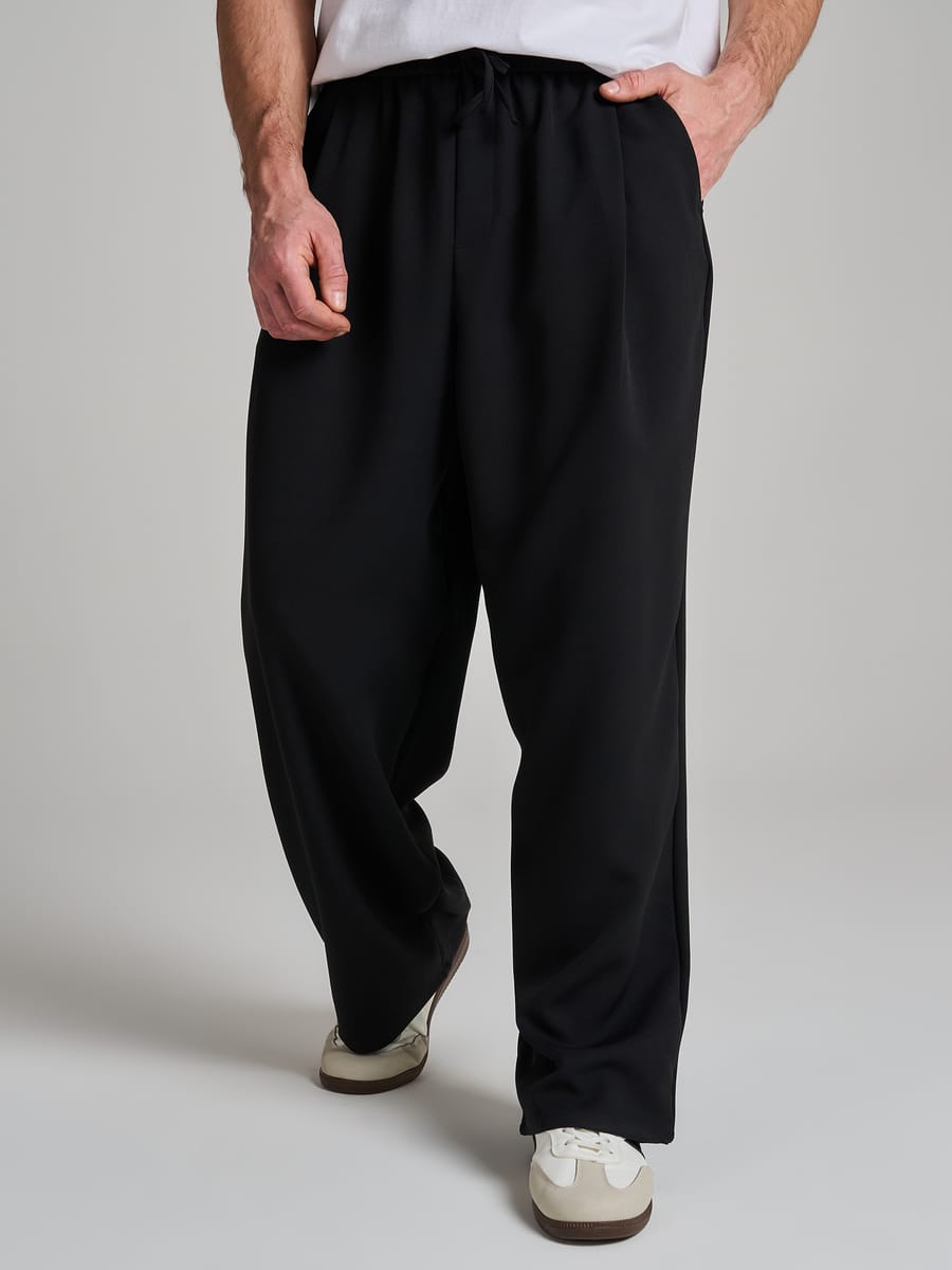 Мужские спортивные брюки от бренда ТВОЕ — это сочетание комфорта, свободы движений и актуального молодёжного стиля. Модель выполнена в универсальном чёрном однотонном оттенке, который легко вписывается в повседневный гардероб и гармонично сочетается с разной спортивной и casual‑одеждой. Широкий свободный крой придаёт штанам непринуждённый, динамичный облик и обеспечивает полную свободу действий — будь то интенсивная тренировка в тренажёрном зале, пробежка на свежем воздухе или неспешная прогулка по городу. Удобство посадки подчёркивает эластичный пояс на резинке с регулируемыми завязками: он надёжно фиксирует треники на талии, позволяя при этом настраивать объём по индивидуальным предпочтениям.