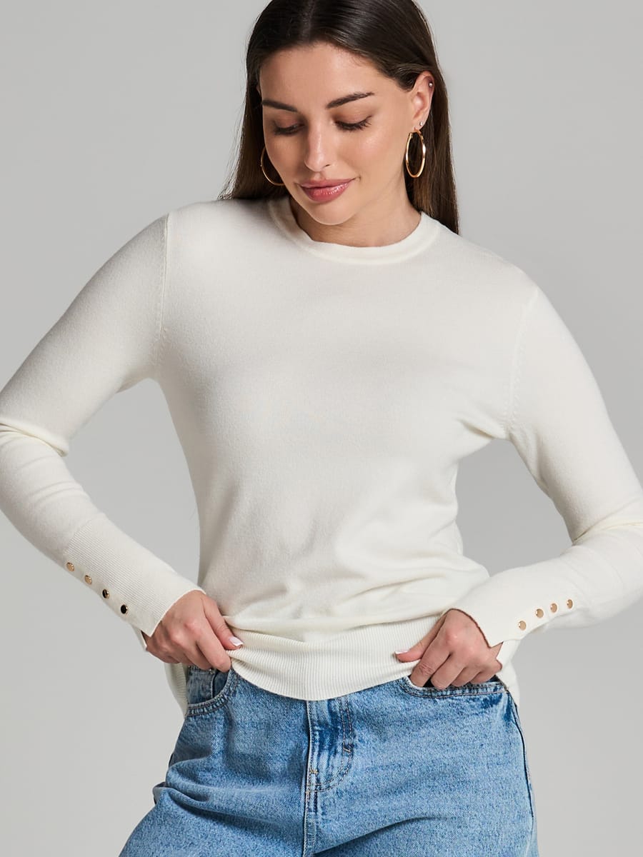 Изысканный однотонный джемпер в классическом черном цвете от бренда ТВОЕ — воплощение элегантности и комфорта для современной женщины. Модель прямого кроя с классическим круглым вырезом горловины создает безупречный силуэт, отвечающий трендам сезона 2025 года. Особая деталь — декоративные золотистые пуговицы на манжетах длинных рукавов — придает модели утонченный шик и делает образ более выразительным. Мягкий трикотажный материал с добавлением искусственной шерсти обеспечивает непревзойденный комфорт и тепло в прохладные дни.