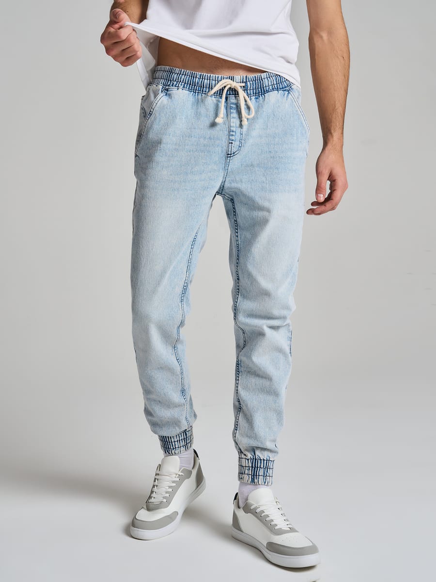 Модные джинсы джоггеры — это идеальное сочетание комфорта и стиля. Зауженная модель станет незаменимой частью гардероба современного мужчины. Голубая расцветка с вареным эффектом создает модный Y2K-образ. Эластичная талия с регулируемыми завязками гарантирует идеальную посадку.