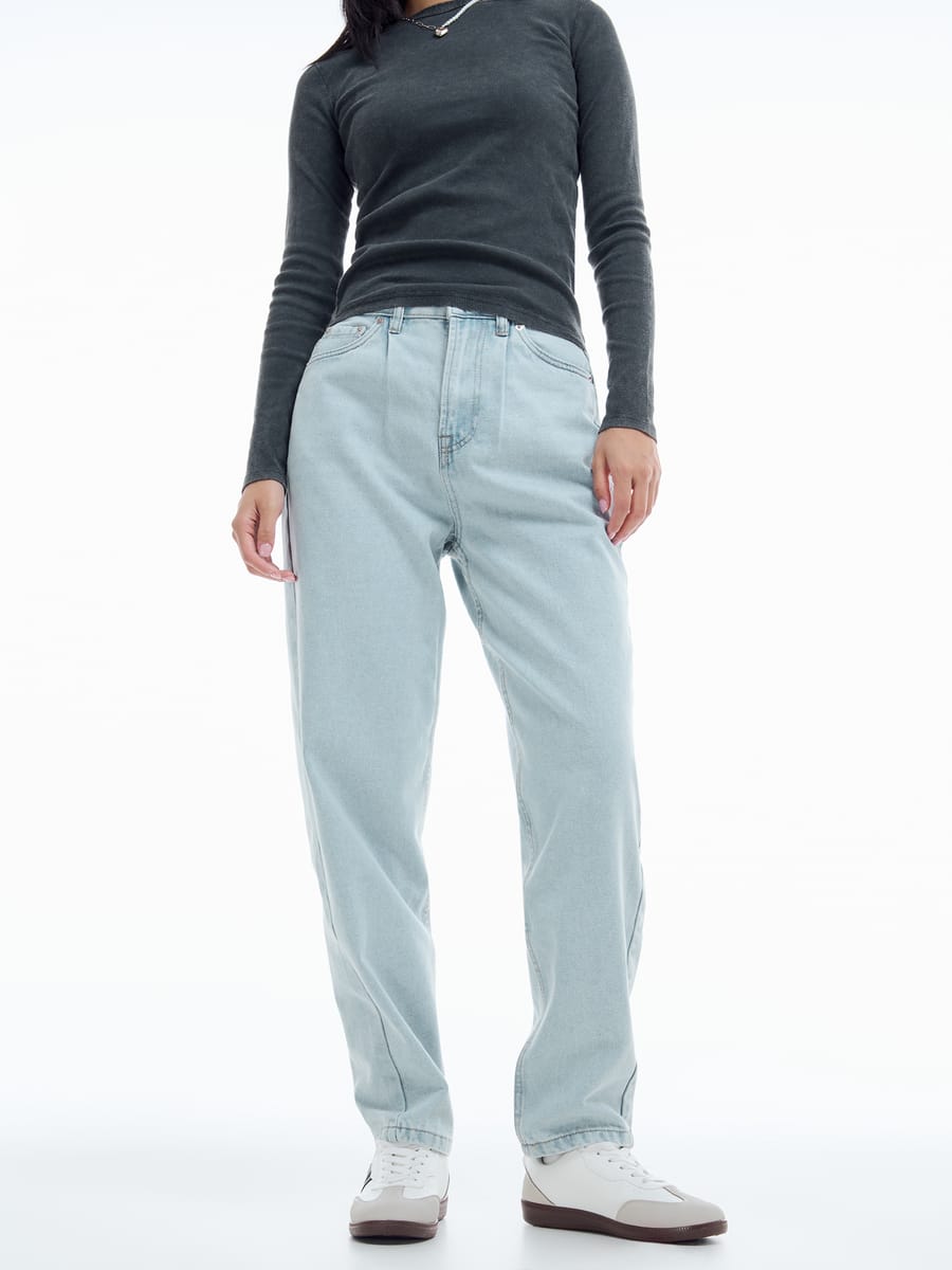 Икона стиля в голубом исполнении — модные джинсы момы с элегантными защипами на талии. Модель воплощает в себе все тренды y2k и становится must-have этого сезона. Завышенная посадка с декоративными защипами создает изящный силуэт, а зауженный крой подчеркивает женственность образа.
