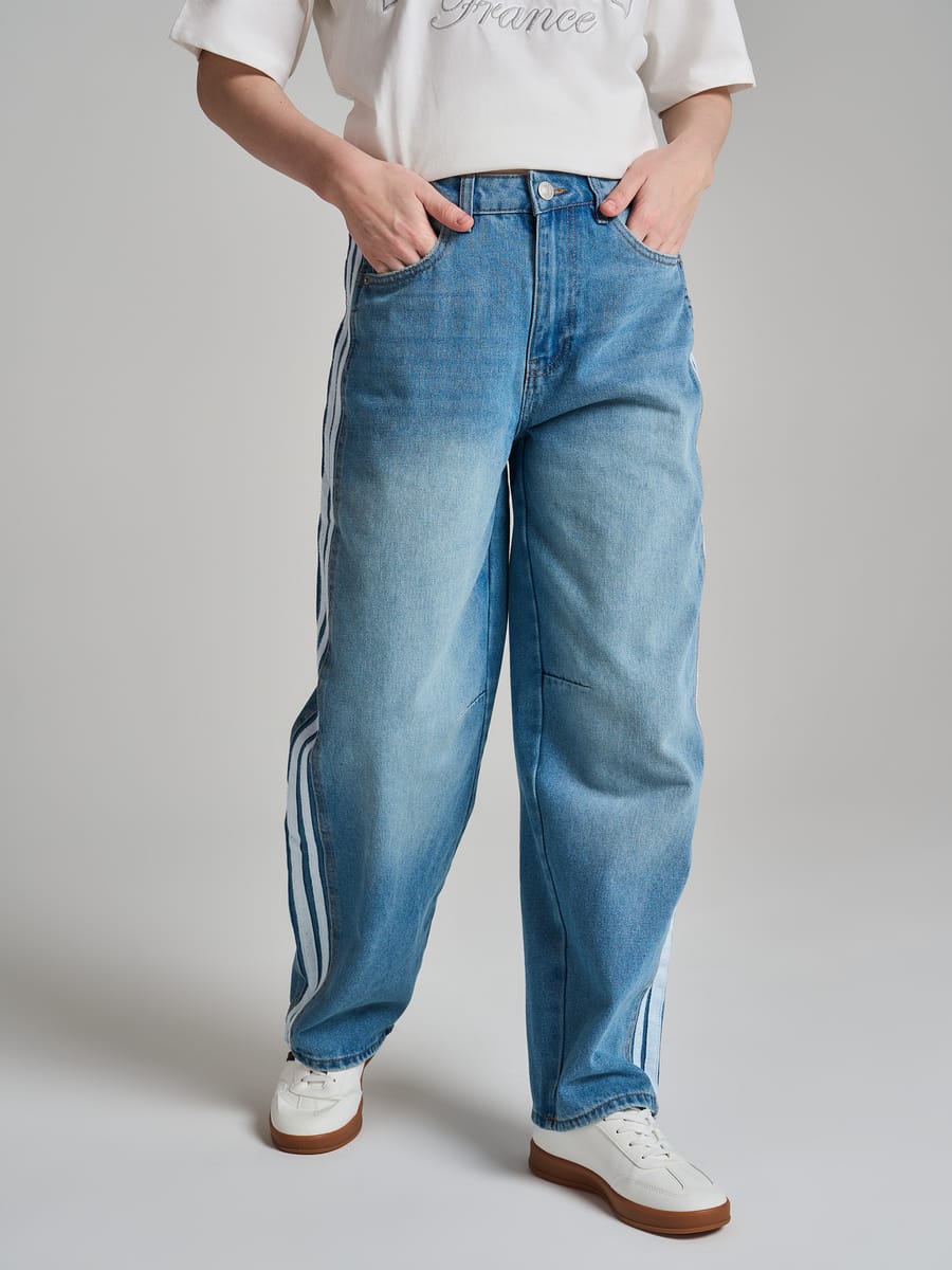 Джинсы Balloon от бренда ТВОЕ — это смелый взгляд на классический предмет гардероба, где традиции сочетаются с современными трендами. Модель завораживает своим силуэтом: деликатно расширенные в бёдрах, они плавно сужаются к низу, создавая изящный, динамичный контур, который подчёркивает женственность и добавляет образу лёгкую ноту бунтарства. Особую выразительность джинсам придают стильные лампасы по бокам — тонкий, но заметный акцент, который привносит в образ спортивный шик и делает силуэт визуально более вытянутым.