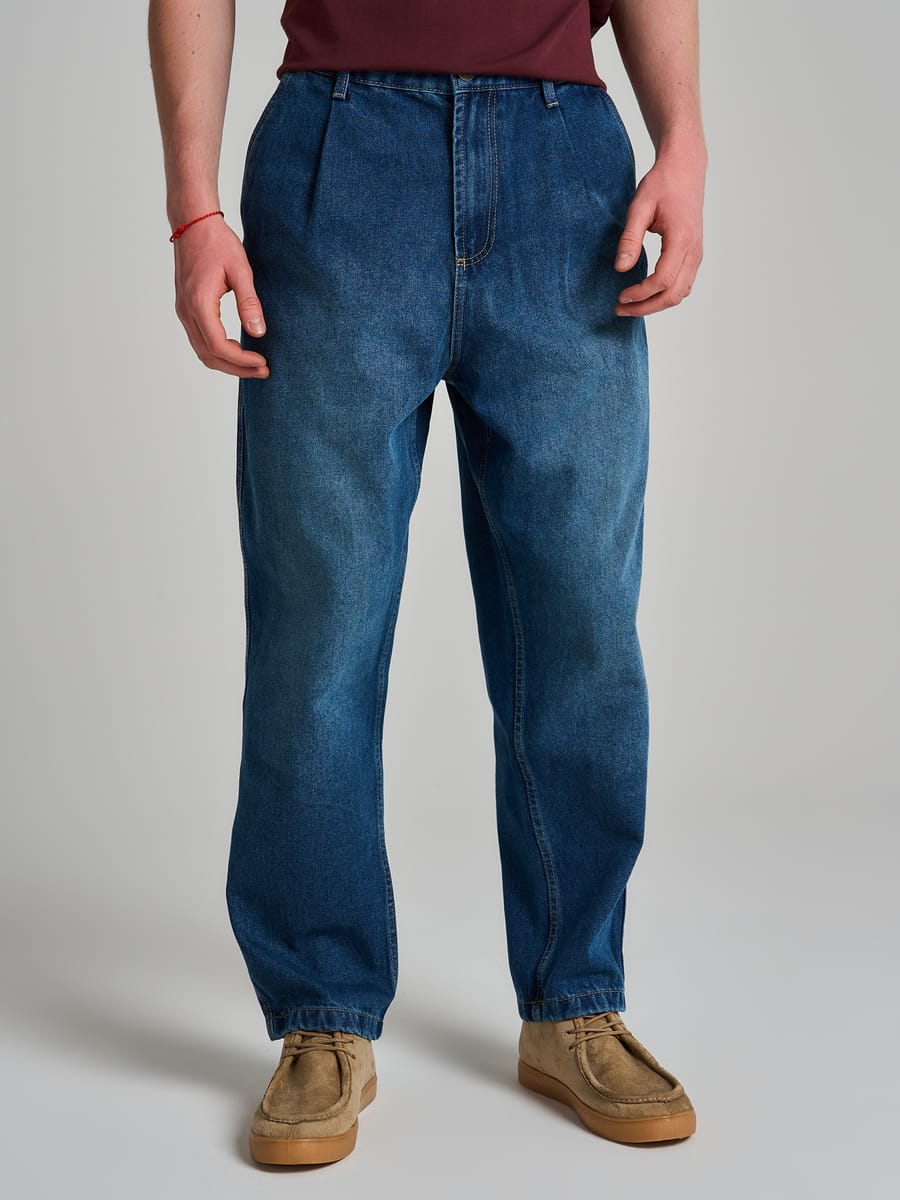 Широкие зауженные мужские джинсы бананы ТВОЕ будут незаменимы в любом гардеробе. Они сшиты из легкого 100% хлопка, позволяют коже дышать и большемерят. Их можно носить с тонкой футболкой, оверсайз свитером, теплым джемпером или под пиджак в зависимости от повода. Они имеют среднюю посадку, классическую молнию и пуговицу в качестве застежки, накладные и прорезные карманы