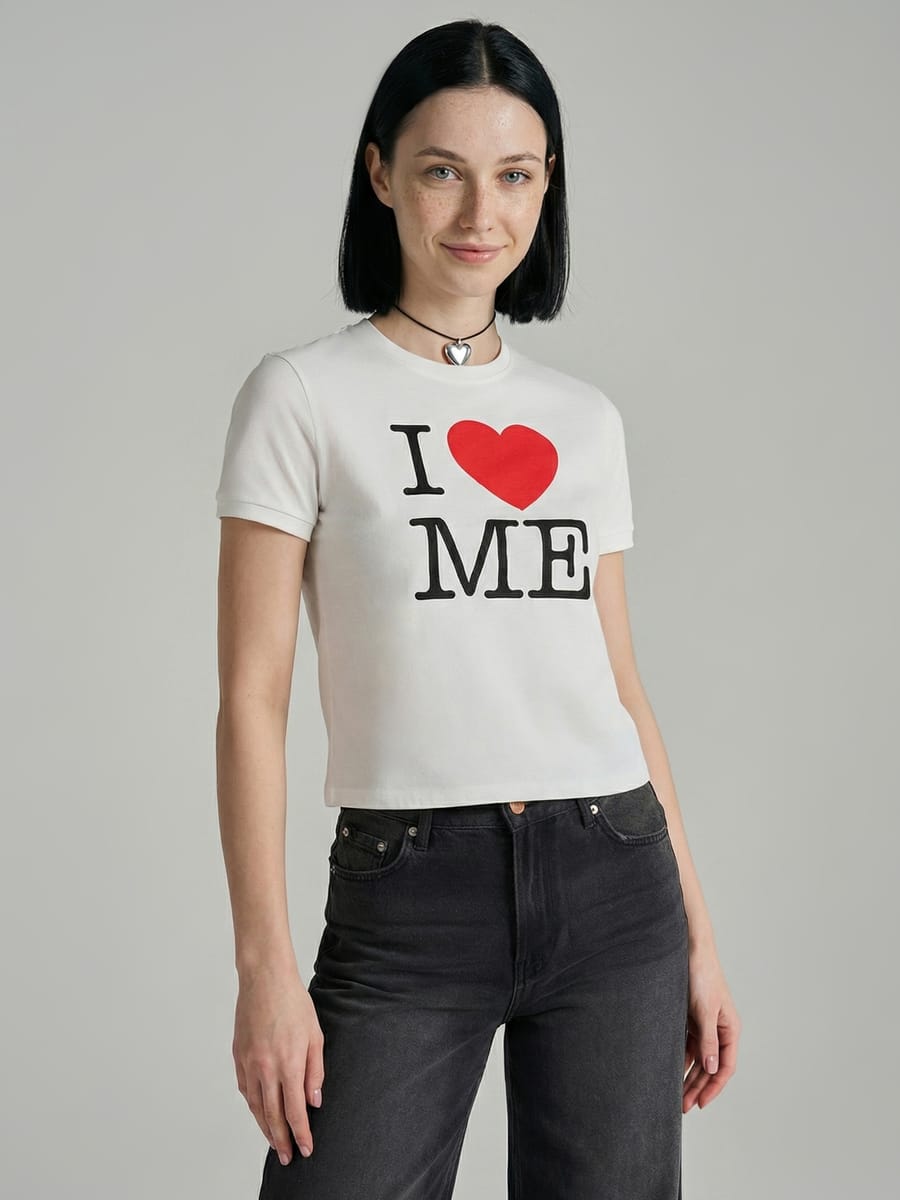 Женская футболка от бренда ТВОЕ — лёгкий и стильный спутник для активной жизни и самовыражения. Чистый белый цвет создаёт безупречный фон для яркого акцента: надписи «I love me» и выразительного красного сердца. Этот милый и вдохновляющий принт напоминает о важности любви к себе и добавляет образу лёгкую игривость и позитив.