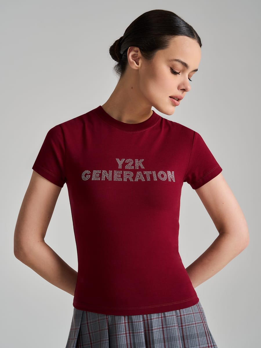 Женская футболка от бренда ТВОЕ в насыщенном бордовом оттенке — это стильный оммаж эстетике Y2K, где ретро нотки органично переплетаются с современными требованиями к комфорту и функциональности. Визуальный акцент модели — сверкающая надпись «Y2K Generation», выполненная из страз. Этот декоративный элемент мгновенно переносит нас в атмосферу нулевых, придавая вещи характер и узнаваемость.