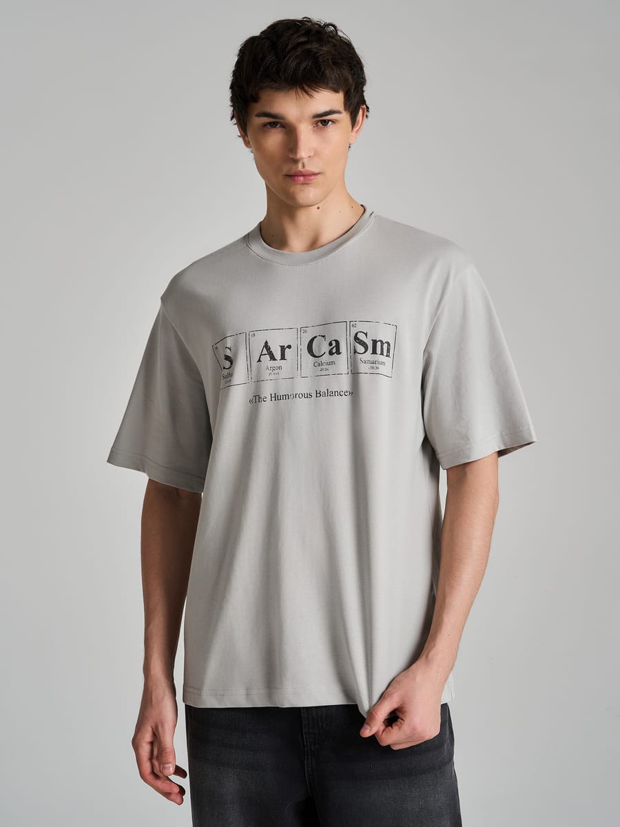 Необычная футболка в сдержанном сером оттенке — идеальный выбор для тех, кто ценит не только комфорт, но и оригинальные дизайнерские решения. Особенность модели — креативный принт, соединяющий науку и иронию: элементы таблицы Менделеева складываются в слово Sarcasm.