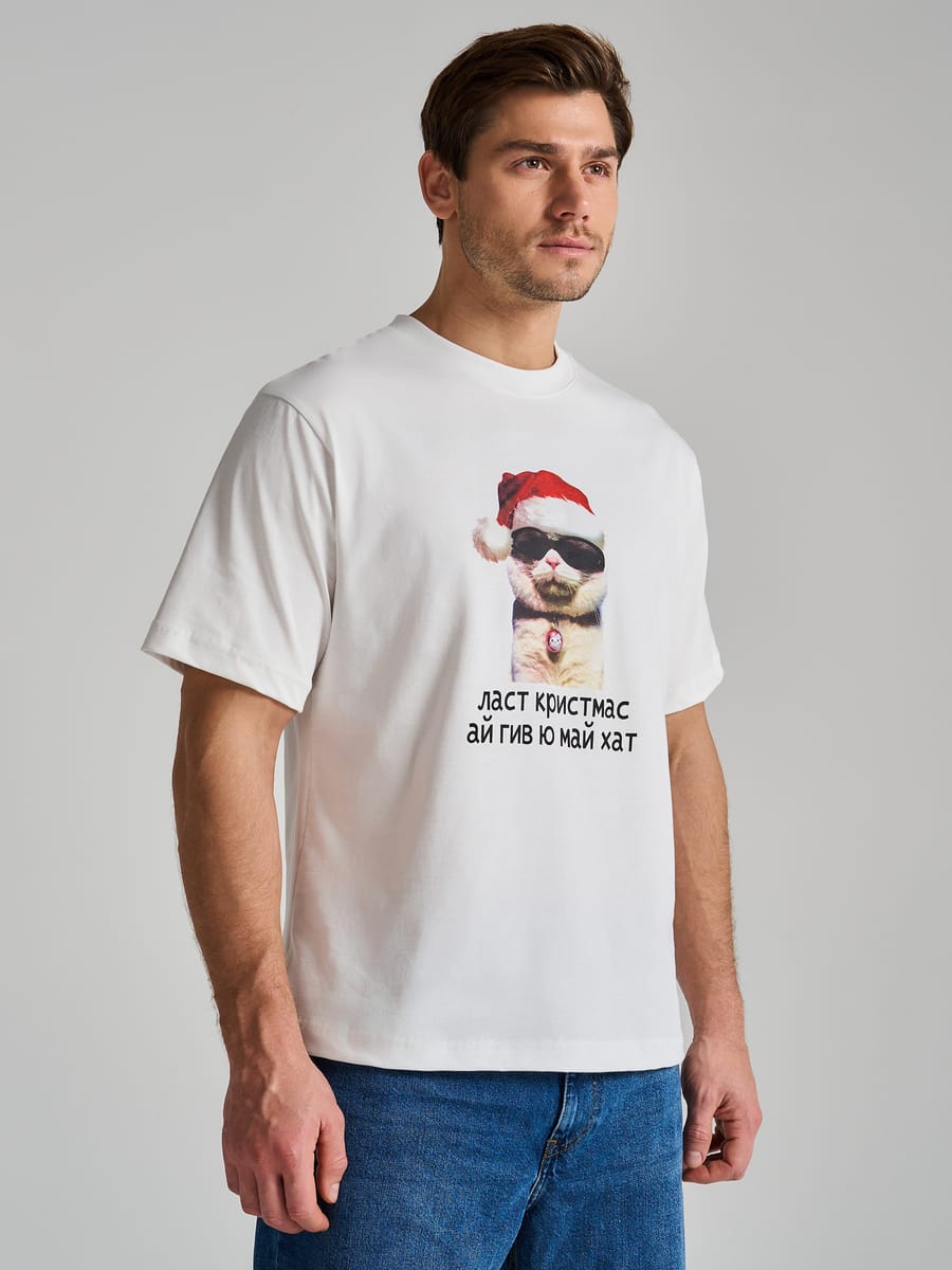 Мужская футболка от бренда ТВОЕ — это сочетание непринуждённого стиля и комфорта, которое подарит настроение в преддверии новогодних праздников. Модель выполнена в чистом белом цвете, который служит идеальным фоном для оригинального принта: милый котик изображён с новогодним колпачком и ироничной надписью «Ласт Кристмас ай гив ю май хат»