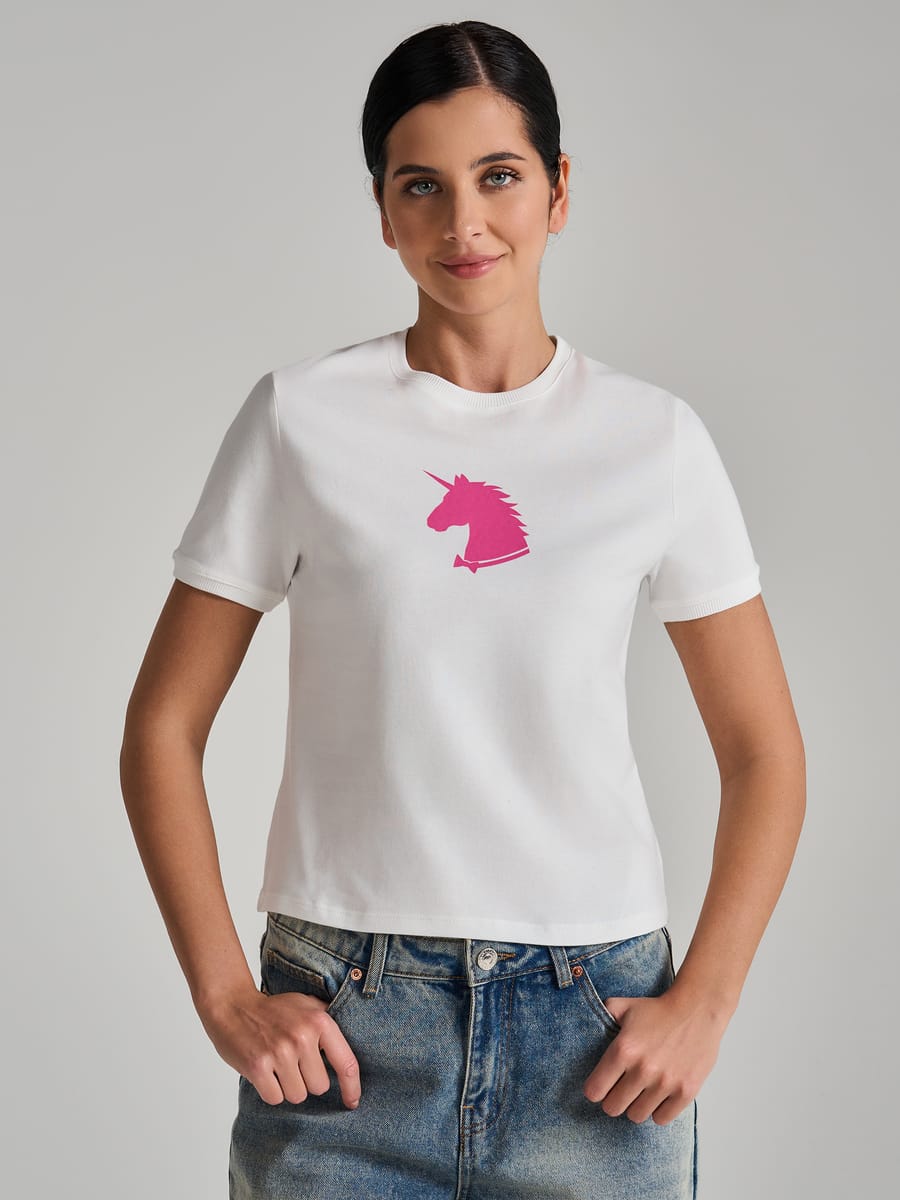 Модная футболка от ТВОЕ — идеальный выбор для девушек и женщин, которые ценят комфорт, следят за трендами и любят добавлять в образ игривые акценты. Белоснежный фон с очаровательным розовым принтом единорога создаёт неповторимый молодёжный стиль, актуальный в сезоне 2025–2026. Яркий розовый принт с единорогом — милый, запоминающийся акцент, придающий модели индивидуальность и игривость.
