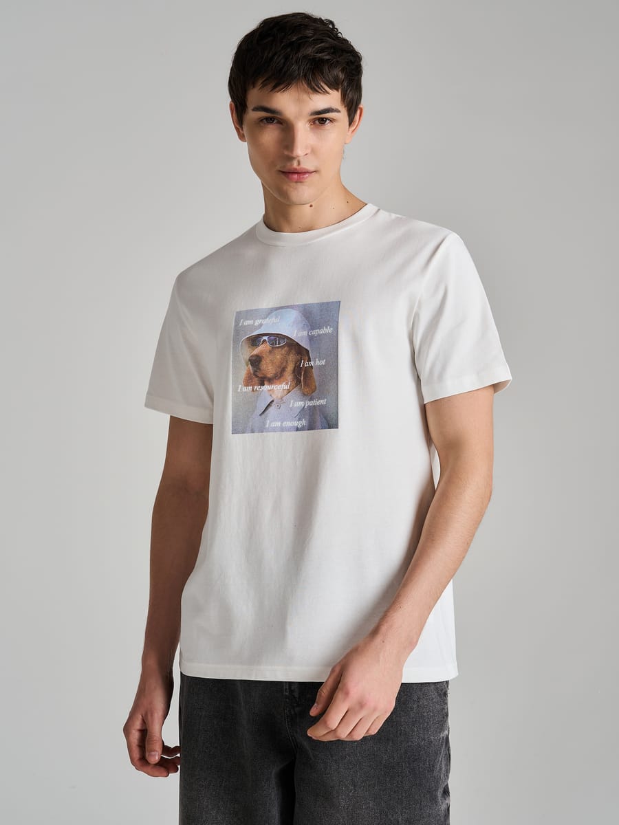 Свежая модель от «ТВОЕ» — стильная хлопковая футболка с оригинальным принтом, которая станет универсальным элементом гардероба для активных мужчин и подростков. Сочетание качественного материала, продуманного кроя и яркого дизайна делает эту вещь незаменимой как для спорта, так и для повседневной носки. Принт с изображением собаки и сопровождающими надписями — оригинальный акцент, придающий модели индивидуальность и игривый характер.