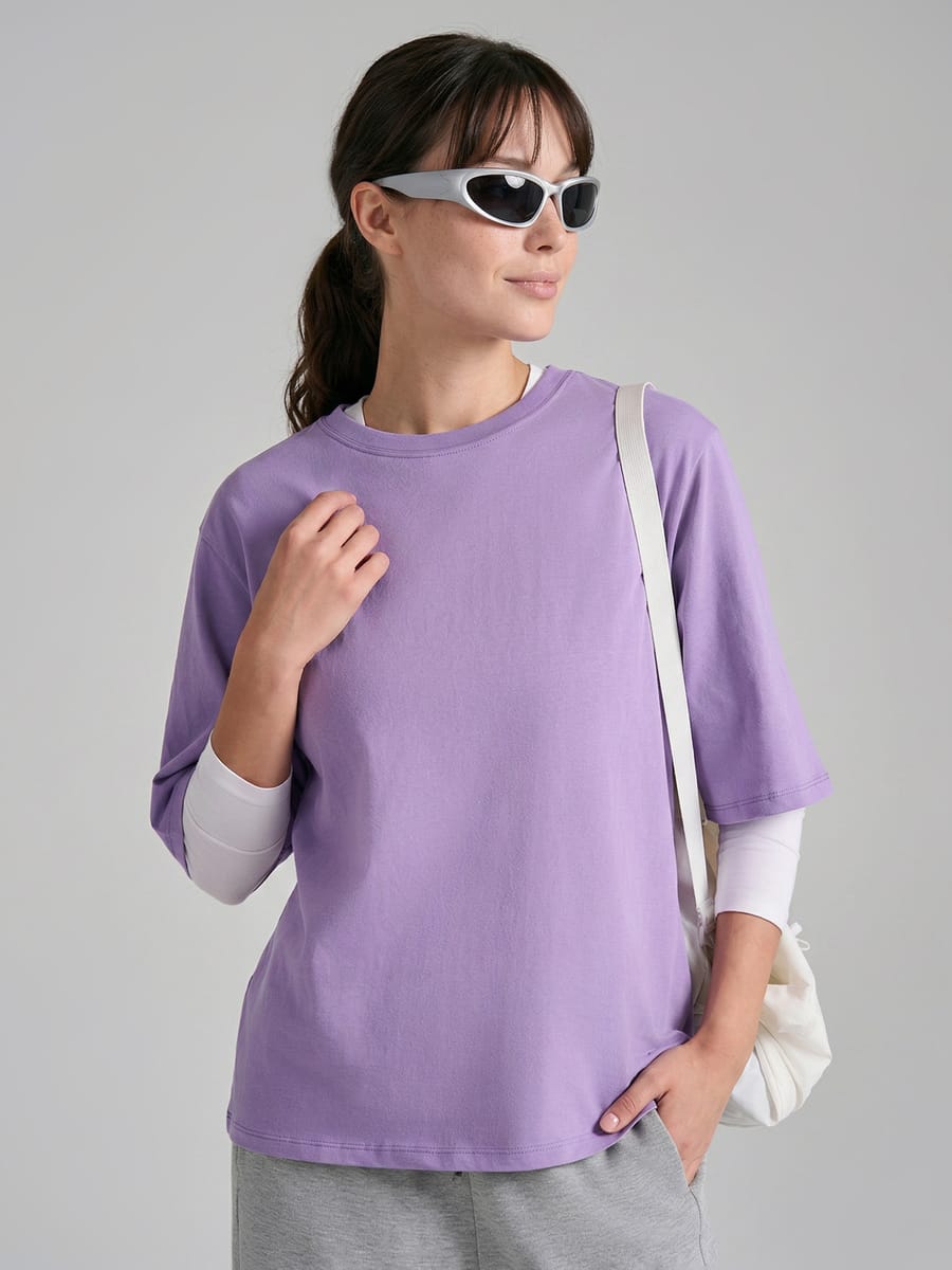Стильная футболка в фиолетовом цвете от бренда ТВОЕ - воплощение комфорта в городском стиле! Оверсайз модель с плотной структурой (200 г/м²) станет вашей любимой вещью в гардеробе! Белый лонгслив не входит в набор.