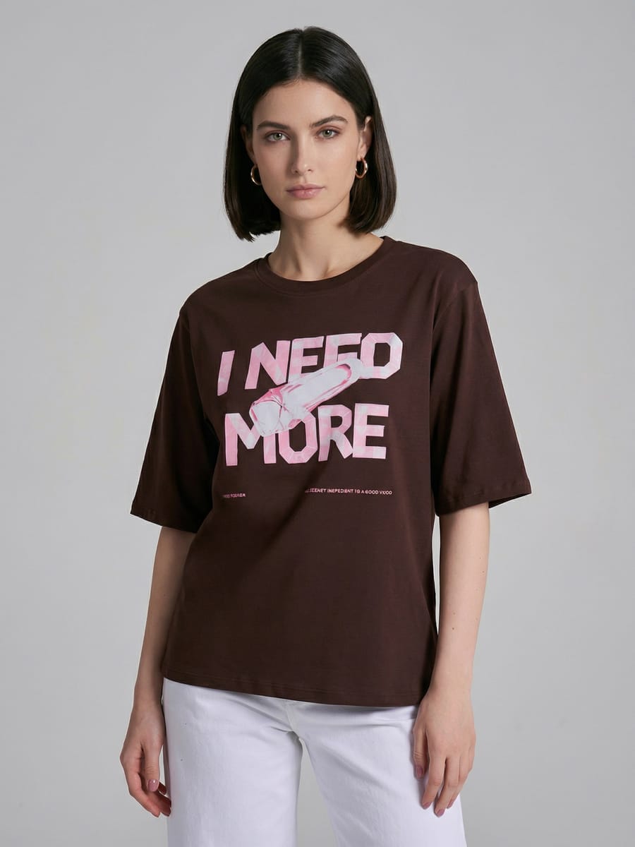 Женская футболка в стиле оверсайз от бренда ТВОЕ – идеальное сочетание комфорта и современного дизайна с дерзким характером! Модель выполнена из 100% натурального хлопка плотностью 200 г/м², что обеспечивает отличную носкость и комфортную посадку. Благородный коричневый цвет в сочетании с ярким принтом и надписью I need more создает стильный образ с характером.