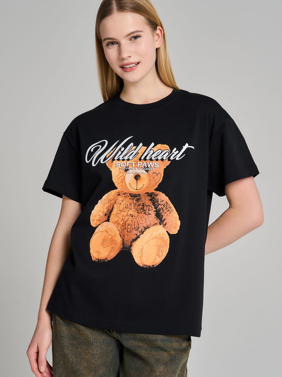 Женская футболка от бренда ТВОЕ — это идеальное сочетание уюта, стиля и комфорта, которое придётся по вкусу и подросткам, и взрослым девушкам. ёрный цвет придаёт вещи лаконичность и элегантность, делая её идеальной базой для самых разных образов. Главный акцент — милый принт с плюшевым медведем, который добавляет модели нотку трогательности и игривости, превращая обычную футболку в выразительный элемент гардероба.