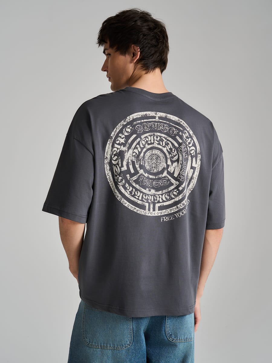 Модная футболка в стиле оверсайз — идеальный выбор для тех, кто ценит комфорт и выразительный дизайн. Глубокий тёмно-серый оттенок создаёт лаконичную базу, а оригинальный принт на спине добавляет образу индивидуальности. На спине — графический принт в виде лабиринта и надпись Free your mind, которая вдохновляет на свободу мышления и самовыражения.