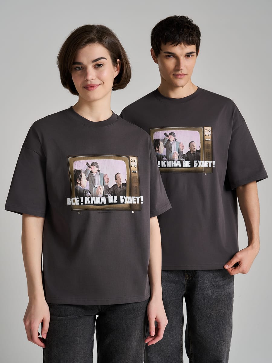 Серая футболка в коллаборации с Мосфильм с культовой фразой «Всё! Кина не будет!» из фильма «Джентльмены удачи» привнесет нотку юмора в ваш стиль. Oversize крой и 100% хлопок обеспечивают комфорт и свободу движений. Спущенный рукав добавляет модный акцент, делая её идеальным выбором для повседневного образа.