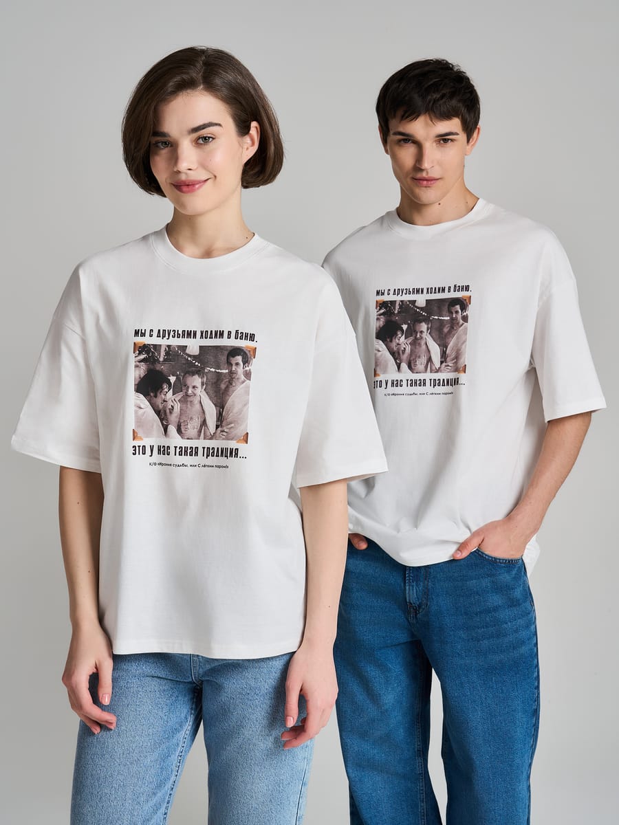 Футболка от бренда ТВОЕ — это уникальная коллаборация с Мосфильмом, посвященная Новому году. Она украшена принтом из кинофильма Ирония судьбы, или С лёгким паром!, что делает ее отличным подарком для поклонников кино и стиля. Кофта выполнена в свободном крое, что обеспечивает комфорт и свободу движений. Она белого цвета, что делает ее универсальной и легко сочетаемой с различными элементами гардероба. Классический крой и 100% хлопок гарантируют высокое качество и долговечность. Футболка подходит как для мужчин, так и для женщин (унисекс), что делает ее идеальным выбором для парных образов.