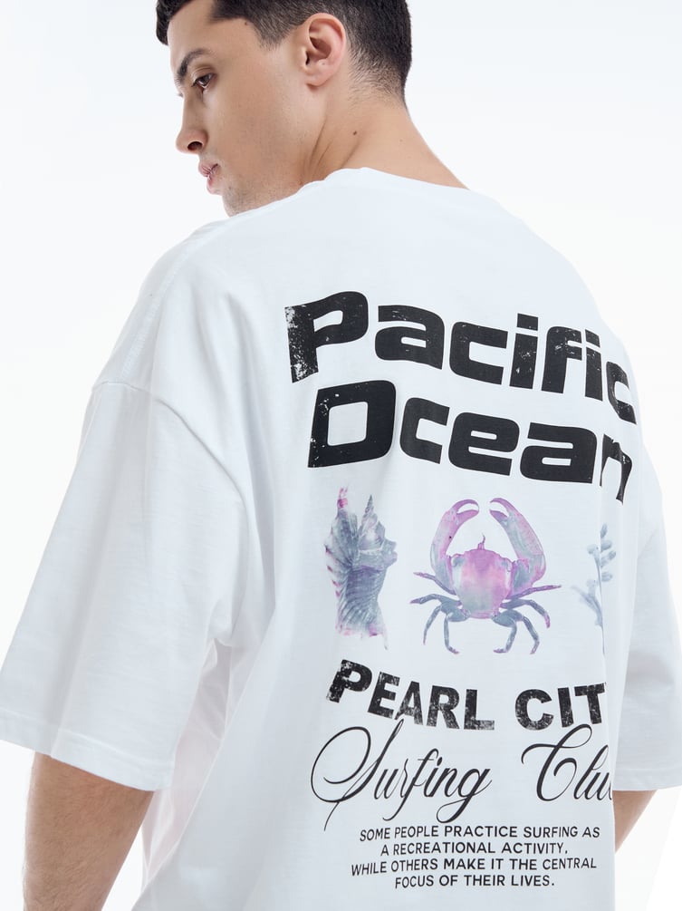 Стильная объемная футболка в белом цвете с уникальным принтом краба и надписью Pacific Ocean на спине – воплощение современного молодежного стиля. Модель выполнена в популярном оверсайз-силуэте, что делает её идеальным выбором для тех, кто ценит комфорт и модные тенденции. Высокая плотность ткани (220 г/м²) гарантирует долговечность изделия.