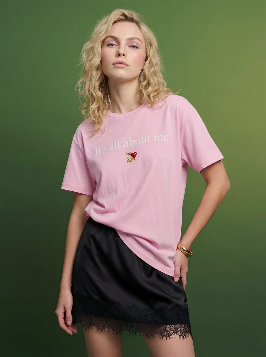 Футболка от бренда ТВОЕ — это яркое воплощение молодёжного стиля и комфорта, которое задаёт тон модным трендам 2025–2026 годов. Нежно‑розовый оттенок придаёт модели особую свежесть и женственность, а забавный принт с котом и дерзкой надписью «It’s all about me» добавляет характеру и игривости. Оверсайз‑крой придаёт футболке непринуждённый, расслабленный силуэт, который не сковывает движений и подчёркивает современную эстетику свободы. Короткий рукав и круглый вырез выполнены с безупречной аккуратностью, обеспечивая комфорт в любой ситуации.