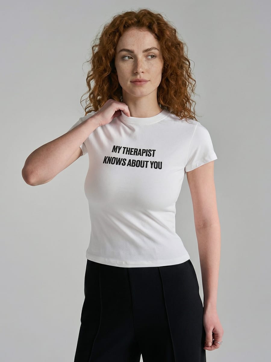 Женская футболка от бренда ТВОЕ — это гармоничное сочетание комфорта, стиля и лёгкой иронии. Чистый белый оттенок придаёт модели выразительность и позволяет легко вписать её в разнообразные образы — от повседневных до спортивно‑стильных. Короткий рукав и круглый вырез делают модель универсальной и лаконичной, а нестандартная надпись «my therapist knows about you» на передней части добавляет образу игривости и индивидуальности.
