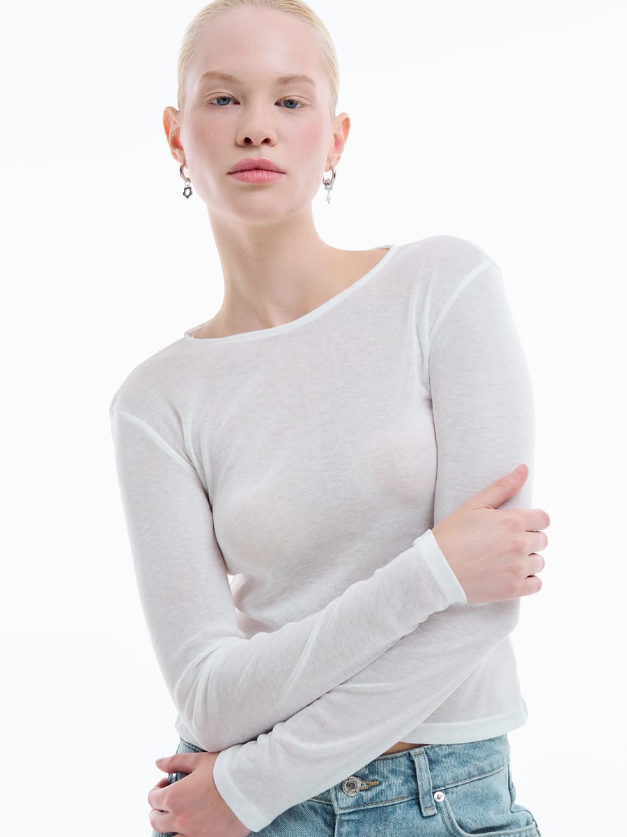 Изысканный лонгслив из полупрозрачного материала — идеальное сочетание комфорта и стиля. Модель выполнена из легкого полиэстера плотностью 135 г/м², что делает её незаменимой для летних образов. Нежный белый цвет — универсальный оттенок для любого гардероба.