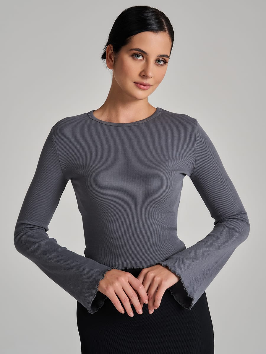 Представляем женский лонгслив от бренда ТВОЕ, который станет идеальным дополнением вашего гардероба. Эта стильная серая кофта выполнена из сочетания хлопка и эластана, что обеспечивает комфорт и свободу движений. Приталенный силуэт и длинные рукава клеш придают изделию модный и элегантный вид.