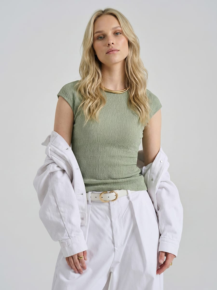Модная футболка от ТВОЕ 2026 года — тренд сезона для стильных образов. Жатая ткань, приталенный крой и драпировка на талии делают модель интересной и нарядной. Короткий цельнокройный рукав и круглый вырез обеспечивают комфорт и универсальность. Лёгкая, дышащая и стильная, она подойдёт для офиса, вечера и повседневных луков. Идеальный выбор для девушек и женщин — добавьте эту популярную футболку в свой гардероб!