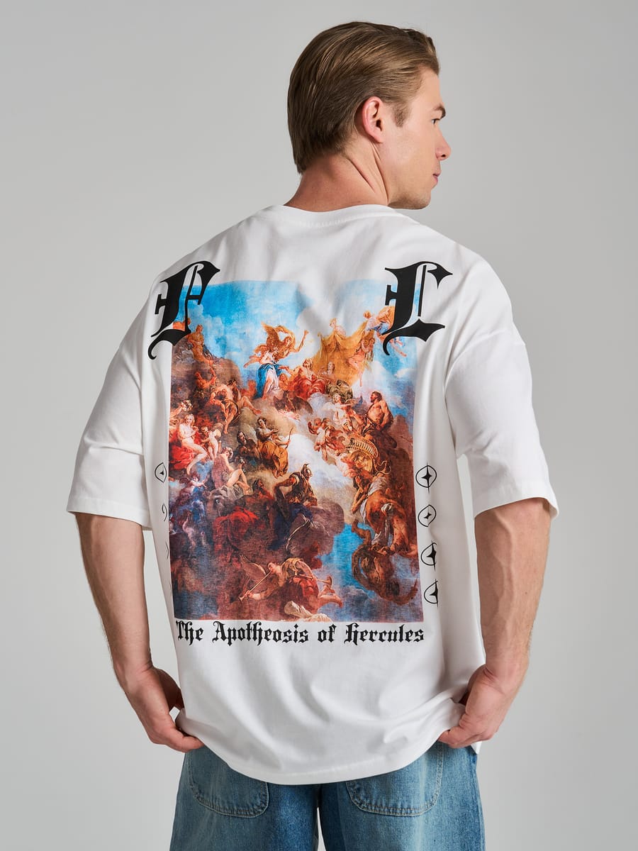 Мужская футболка – это воплощение стиля и комфорта. Изготовлена из 100% хлопка, что обеспечивает мягкость и комфорт при носке, а также не сковывает движения. Особое внимание привлекает принт на спине – фрагмент фрески Апофеоз Геркулеса. Это оригинальное и стильное решение, которое делает кофту настоящим произведением искусства.