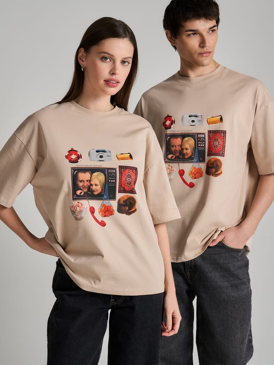 Футболка от бренда ТВОЕ — это уникальная коллаборация с Мосфильмом, посвященная Новому году. Она украшена принтом из кинофильма «Ирония судьбы, или С лёгким паром!», что делает ее отличным подарком для поклонников кино и стиля.