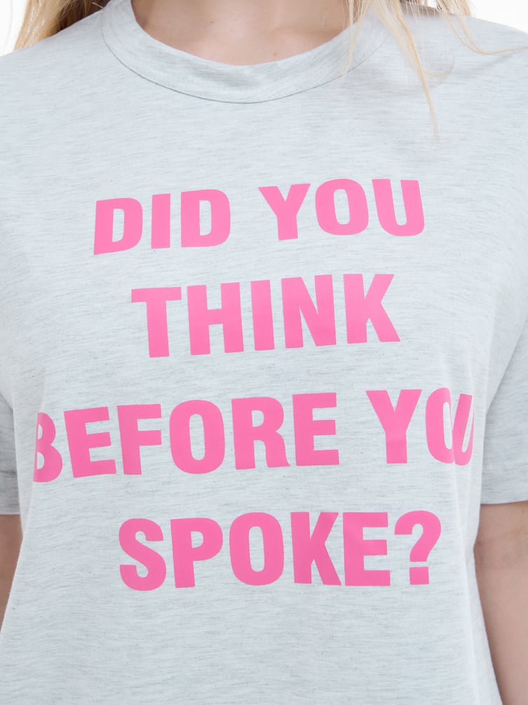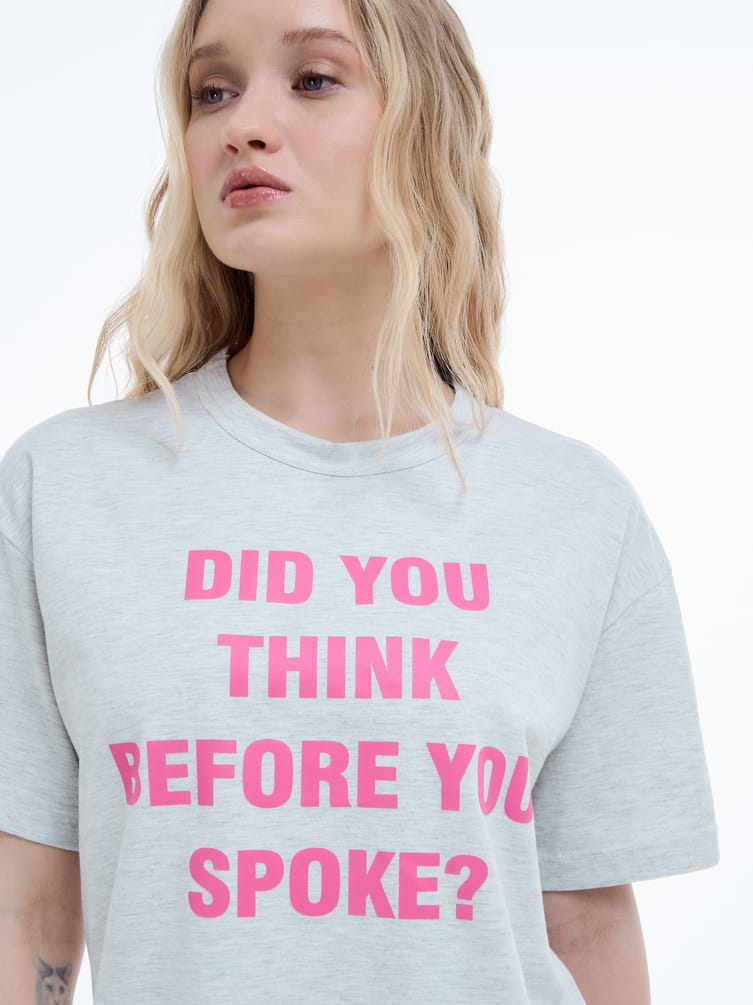 Футболка выполнена в элегантном белом меланже с ярким принтом "Did you think before you spoke?", который добавляет образу особый характер. Свободный крой с круглым вырезом и короткими рукавами создает комфортный силуэт, не стесняющий движений. Особая комбинация материалов (50% полиэстер и 50% хлопок) делает футболку невероятно практичной: она отлично держит форму, быстро сохнет и при этом остается приятной к телу.