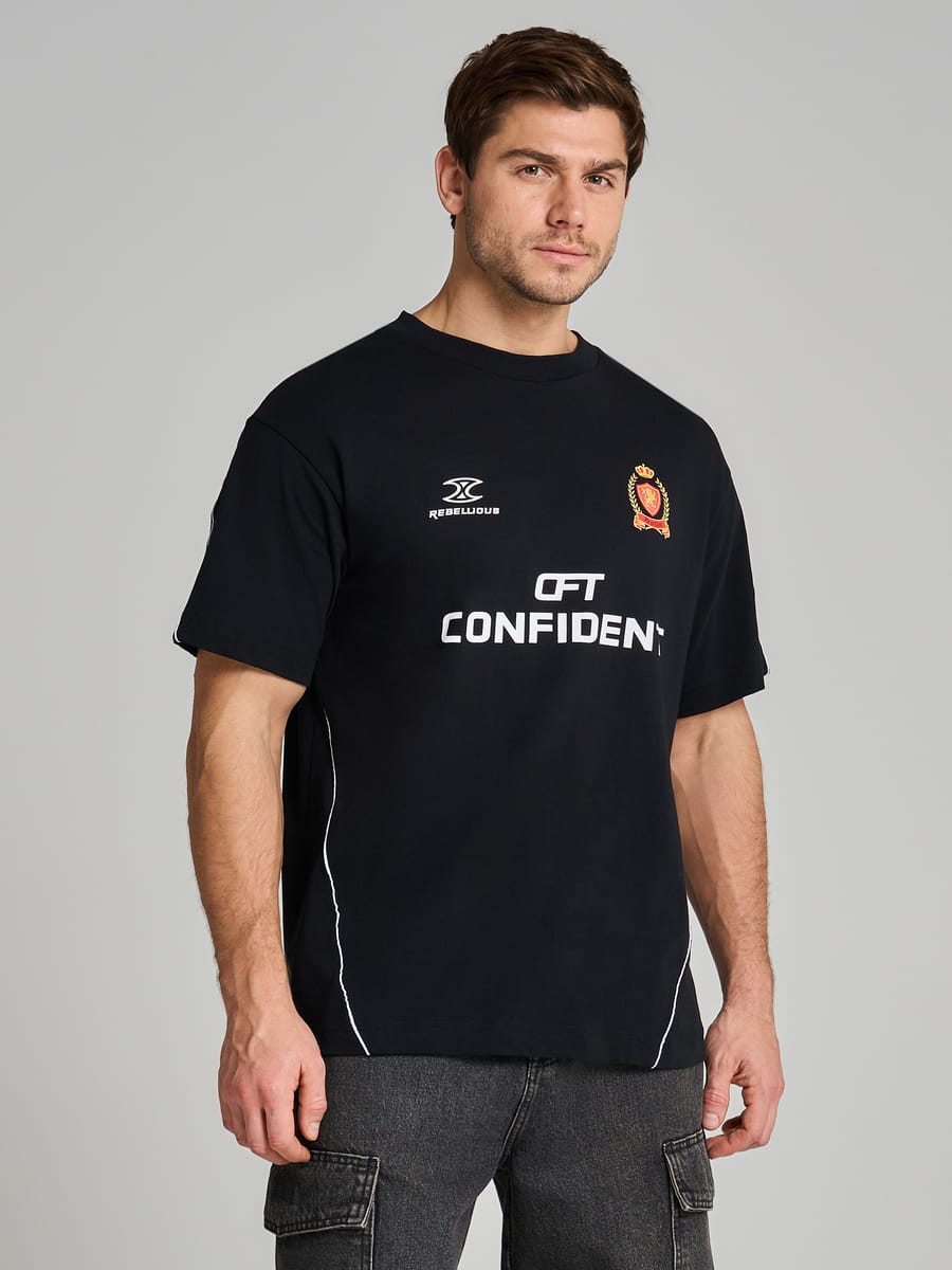 Представляем стильную мужскую футболку свободного кроя, которая станет незаменимой частью гардероба современного мужчины. Модель выполнена в классическом черном цвете, что делает её универсальной для любого образа. Изготовлена из 100% натурального хлопка, обеспечивающего идеальную воздухопроницаемость и долговечность и сохранение формы после стирки. Футболка со стильной надписью Oft Confident и декоративными лампасами— это идеальное сочетание стиля, комфорта и функциональности. Модный дизайн в сочетании с практичностью делает эту модель незаменимой для тех, кто ведет активный образ жизни и следит за трендами.