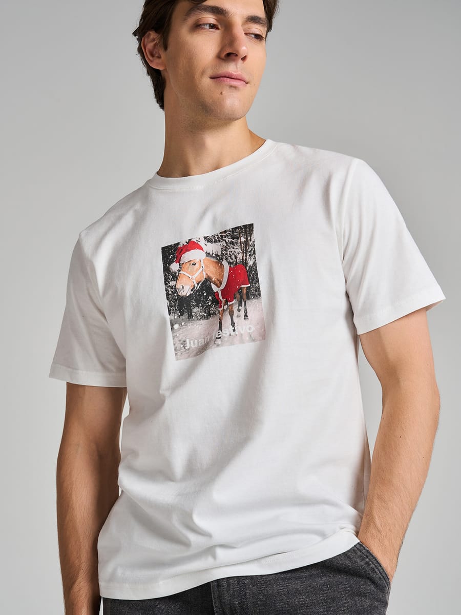 Яркая новогодняя футболка от бренда ТВОЕ — настоящий праздник стиля и комфорта! Оригинальный дизайн с изображением коня в новогоднем колпаке и надписью «Juan Festivo» создаст праздничное настроение и станет изюминкой вашего гардероба.