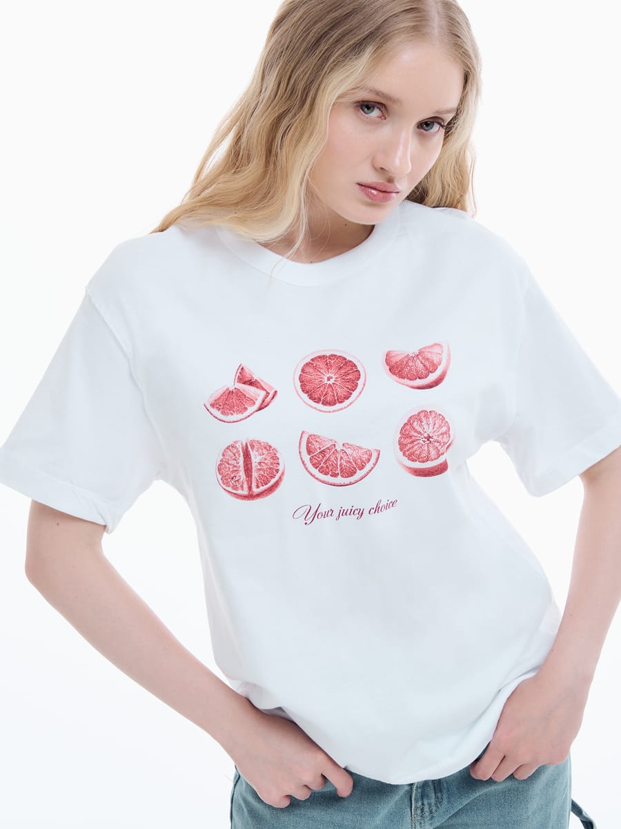 Футболка выполнена в чистом белом цвете с ярким принтом грейпфрута, который добавляет образу игривости и свежести, делая его по-настоящему уникальным. Свободный крой с круглым вырезом и короткими рукавами создает комфортный силуэт, не стесняющий движений. Высококачественный 100% хлопок обеспечивает непревзойденный комфорт и позволяет коже дышать в течение всего дня.