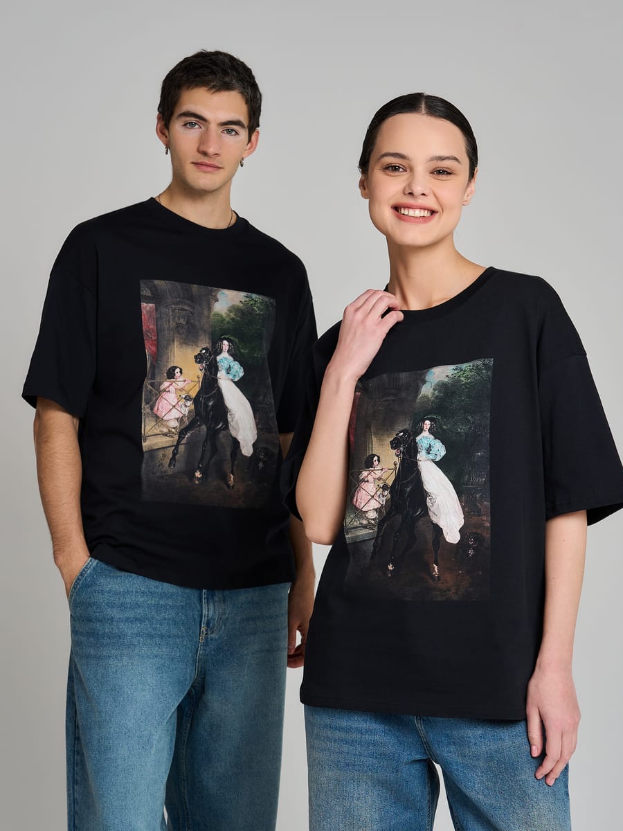 Погрузитесь в мир русского искусства с уникальной футболкой из совместной коллекции бренда ТВОЕ и Третьяковской галереи! Модель вдохновлена шедевром Карла Брюллова «Всадница» — легендарным полотном, которое оживает на вашей одежде в виде яркого, детализированного принта.