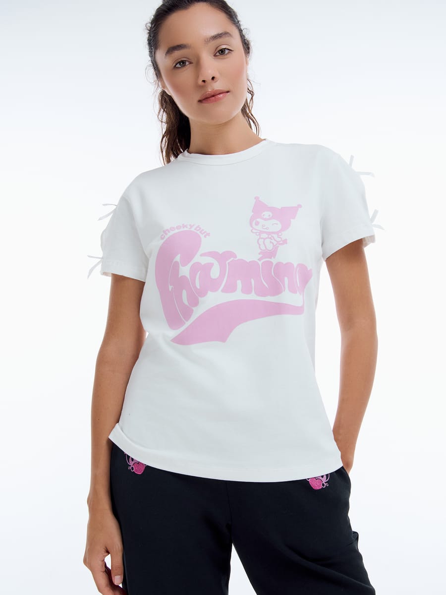 Стильная футболка с изображением культового персонажа Kuromi и надписью Charming от популярного бренда ТВОЕ — идеальное сочетание комфорта и модного дизайна. Модель выполнена из высококачественного материала, состоящего из 92% натурального хлопка и 8% эластана, что обеспечивает превосходную посадку и долговечность изделия.