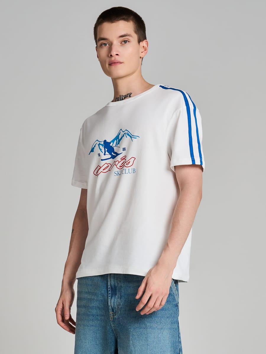 Стильная футболка с оригинальным принтом с изображением лыжника и надписью apres SKI CLUB от бренда ТВОЕ — идеальный выбор для современных мужчин и подростков, ценящих комфорт и модный внешний вид. Модель выполнена в классическом белом цвете с яркими синими лампасами на рукавах, что придает изделию динамичный спортивный характер.