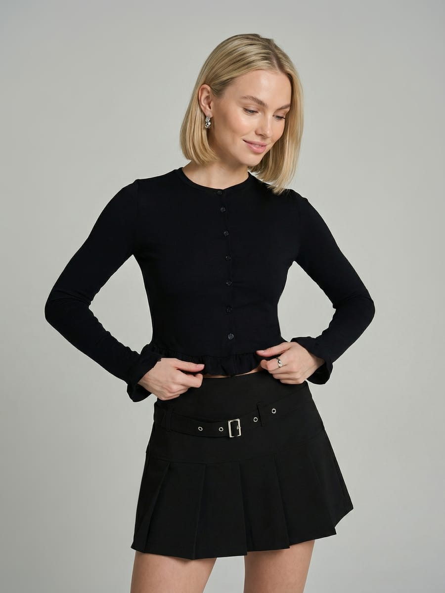 Строгий черный кардиган ТВОЕ — стильная трикотажная модель, которая аккуратно подчёркивает фигуру благодаря приталенному, облегающему крою. Изящные рюши по низу и на рукавах добавляют образу женственности и делают вещь заметной, но без лишней вычурности — то, что нужно для молодёжного гардероба 2026 года.