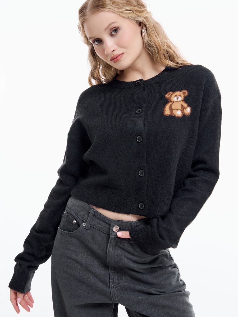 Уютный женский кардиган от бренда ТВОЕ — идеальное сочетание стиля и комфорта для холодного сезона! Черный цвет в сочетании с милым принтом медведя создает нежный и стильный образ, который будет актуален в сезоне 2025 года. Благодаря продуманному составу материалов кардиган отлично держит форму и обеспечивает комфорт при носке. Модель станет отличным выбором как для школьной формы, так и для повседневного гардероба. Теплая и мягкая текстура делает этот кардиган незаменимым в прохладную погоду, а стильный дизайн позволяет создавать модные образы на каждый день.