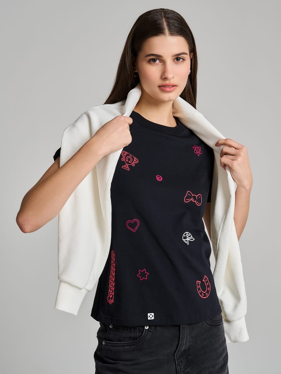 Трендовая модель 2025 года, воплощающая в себе дух стиля y2k и современные модные тенденции. Элегантное сочетание черного цвета с розовым декором делает эту футболку настоящим украшением гардероба. Оригинальный дизайн привлекает внимание изящным принтом, который включает нежные бантики, элегантные кубки, и изящные подковы, расположенные по всей модели.