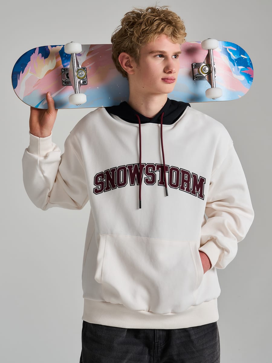 Тёплое худи молочного цвета от российского бренда ТВОЕ — универсальная вещь для холодного сезона. Модель сочетает практичность, комфорт и современный дизайн, оставаясь при этом доступной по цене. Центральным элементом дизайна стала бархатная надпись «Snowstorm» — она придаёт модели индивидуальность и выделяет её из массы стандартных худи. Сочетание молочного фона и чёрного капюшона формирует стильный контраст, делая вещь заметной в любом окружении.