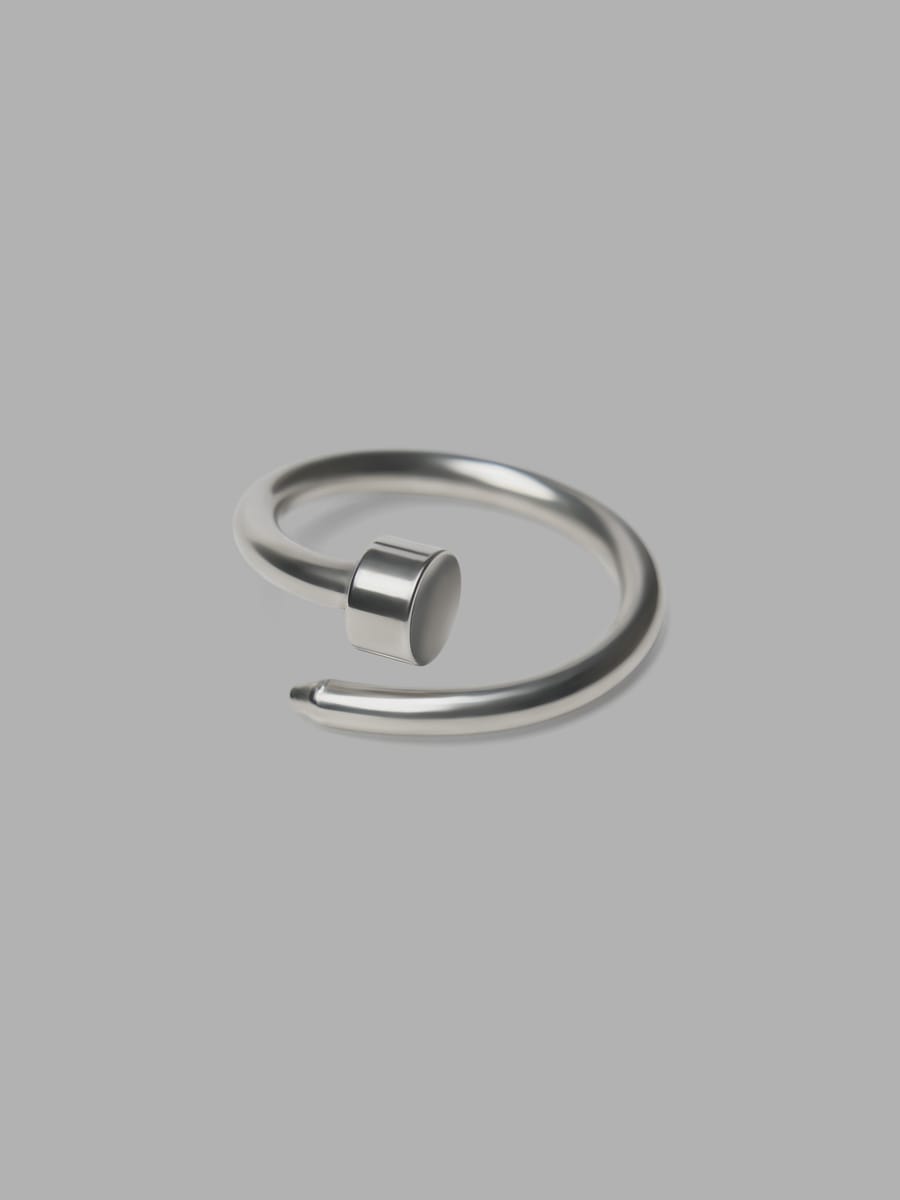 Кольцо от бренда ТВОЕ — смелое украшение, которое переосмысливает привычные формы через призму современного дизайна. Его силуэт напоминает изящный гвоздь: незамкнутая конструкция придаёт изделию лёгкость и динамику, а серебристое покрытие добавляет благородного блеска.