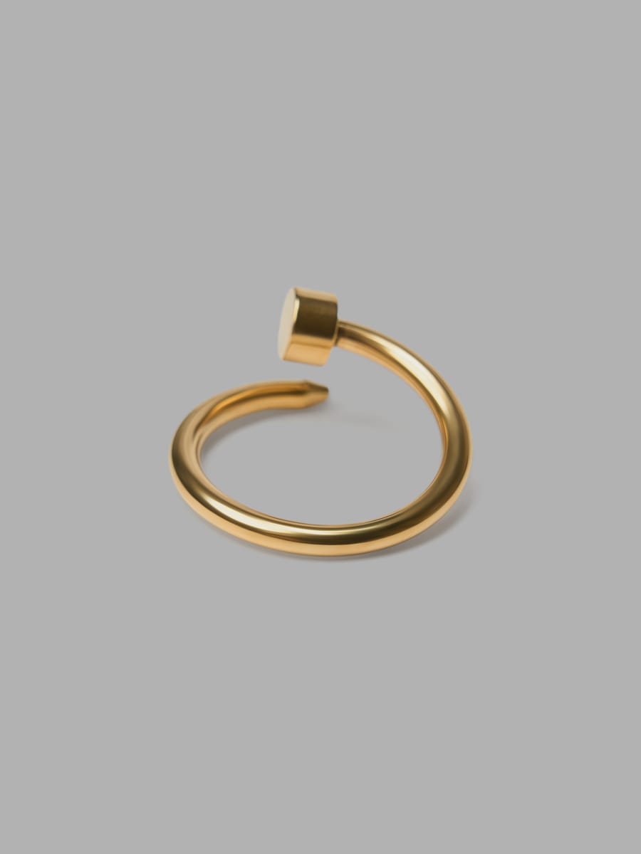 Кольцо от бренда ТВОЕ — смелое украшение, которое переосмысливает привычные формы через призму современного дизайна. Его силуэт напоминает изящный гвоздь: незамкнутая конструкция придаёт изделию лёгкость и динамику, а золотистое покрытие добавляет благородного блеска.