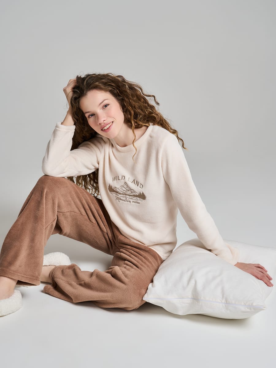 Откройте секрет идеального домашнего уюта с пижамой от бренда ТВОЕ — сочетанием стиля, комфорта и природной эстетики. Комплект состоит из лонгслива бежевого цвета с изысканной вышивкой пейзажа и надписью Northside — тонкий акцент, добавляющий образу индивидуальности и прямых брюк насыщенного коричневого цвета, создающие гармоничное сочетание с верхом. Это не просто домашняя одежда — это приглашение в мир спокойного отдыха и гармонии. Мягкая плюшевая ткань окутывает теплом, а продуманный дизайн с природной тематикой создаёт особое настроение.