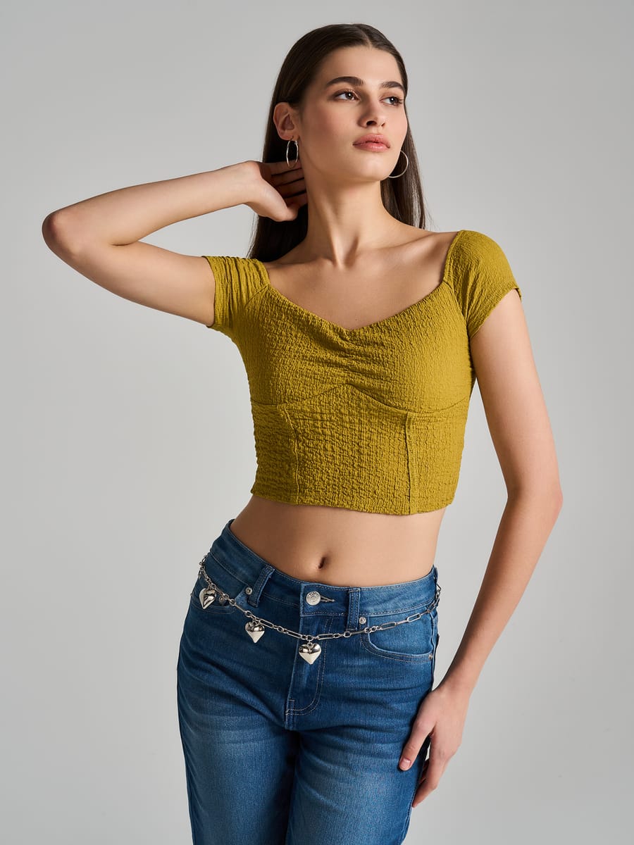 Откройте для себя трендовую модель женской футболки в модном зеленом цвете! Укороченный кроп-фасон и жатая текстура ткани создают современный силуэт, который подчеркнет вашу фигуру и добавит образу стильную изюминку. Модель выполнена из премиальной ткани (98% полиэстер и 2% эластан), что обеспечивает идеальную посадку по фигуре и максимальную практичность. Добавление эластана гарантирует отличную эластичность и комфорт при носке.