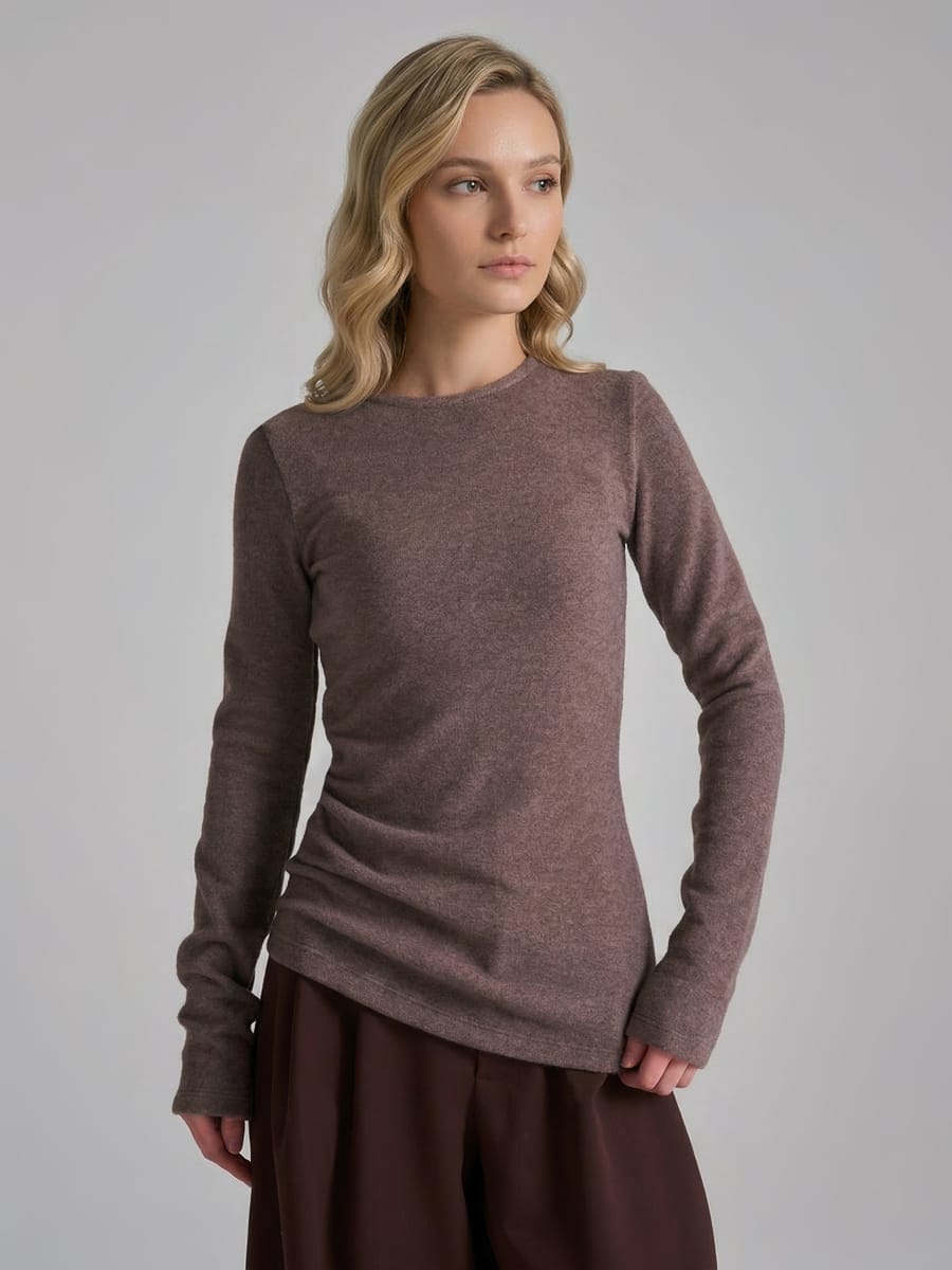 Лонгслив от бренда ТВОЕ в благородном коричневом меланже — это воплощение современной элегантности и универсального комфорта. Рубчиковая фактура трикотажа придаёт модели выразительную текстуру, а продуманный приталенный крой деликатно подчёркивает силуэт, оставаясь при этом удивительно удобным. Особую изюминку дизайну придают изысканные детали: асимметричный низ создаёт динамичный силуэт, а лёгкая драпировка на талии добавляет образу утончённого шарма. Круглый вырез выполнен в лаконичной манере, что делает модель ещё более универсальной.