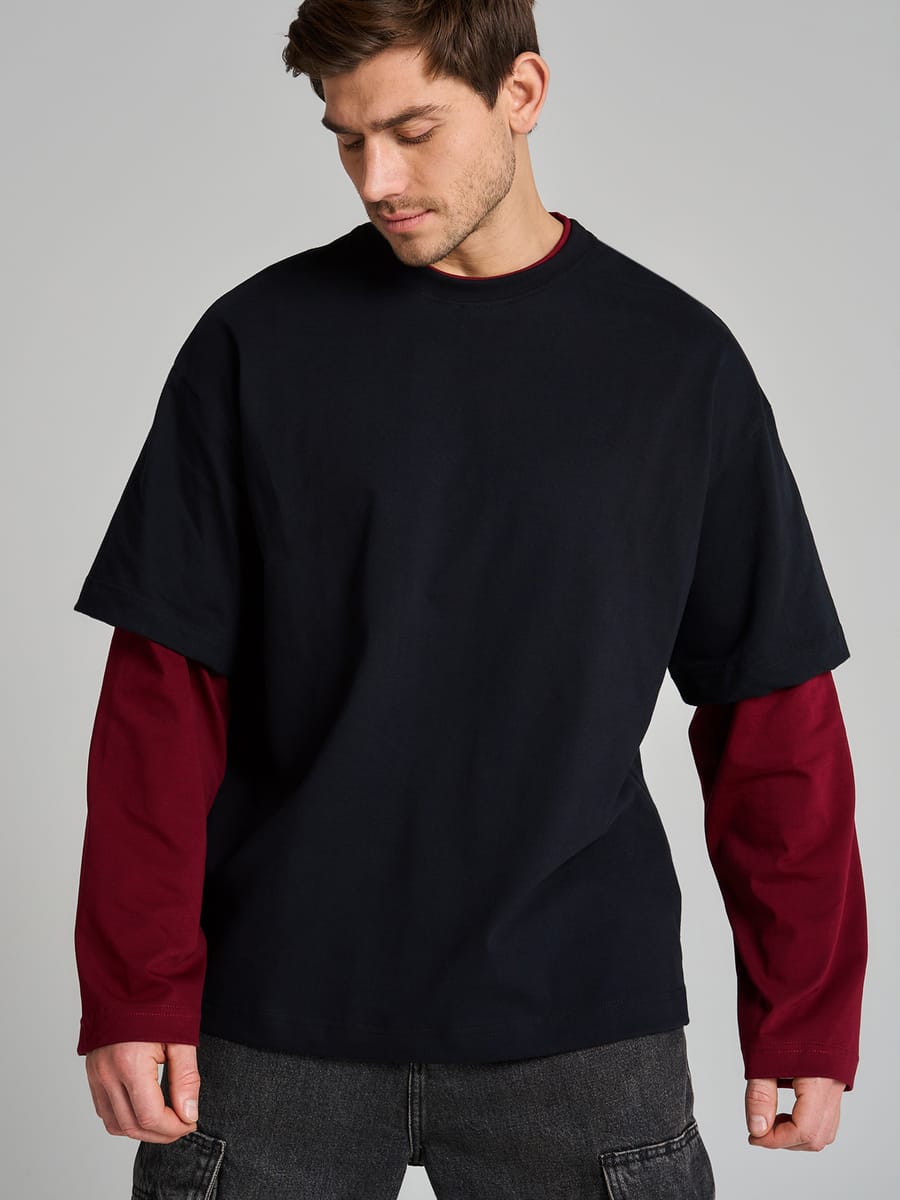 Мужской лонгслив от бренда ТВОЕ — практичная и стильная вещь для повседневного гардероба. Модель сочетает функциональность и актуальные модные тенденции, оставаясь комфортной в носке. Лонгслив выполнен в контрастной цветовой гамме: основной корпус — чёрный, длинные рукава — бордовые. Дизайн включает эффектный элемент — двойной рукав, который придаёт модели индивидуальность. Силуэт оверсайз с объёмной формой и спущенной линией плеч создаёт расслабленный, современный образ. Конструкция имитирует футболку, сохраняя при этом удобство длинного рукава. Круглый вырез остаётся классическим и универсальным решением.