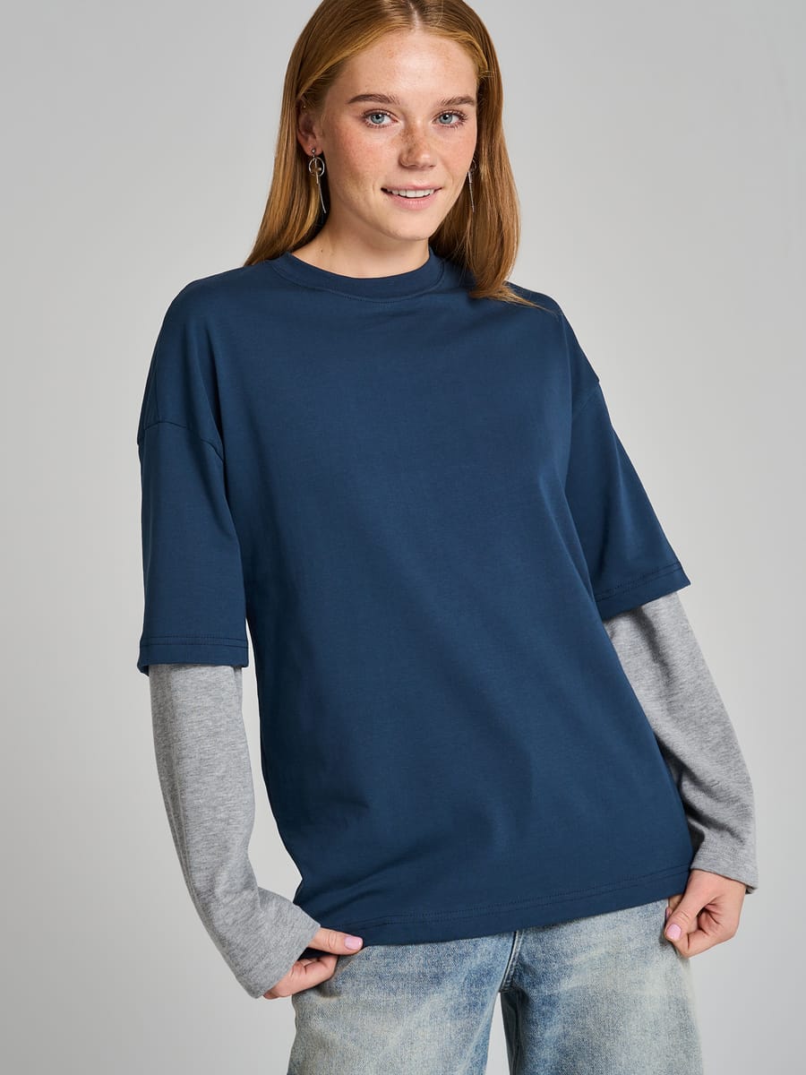 Уникальный дизайн лонгслива ТВОЕ привлекает внимание необычным решением с двойным рукавом: основной синий цвет дополнен серыми длинными элементами, создающими эффект многослойности. Модель выполнена в стиле оверсайз, что делает её особенно актуальной в сезоне 2025. Анатомический крой с спущенной линией плеч обеспечивает свободу движений и комфорт при носке. Круглый вырез и объемный силуэт создают модный Y2K-образ, который идеально подходит для современной девушки.