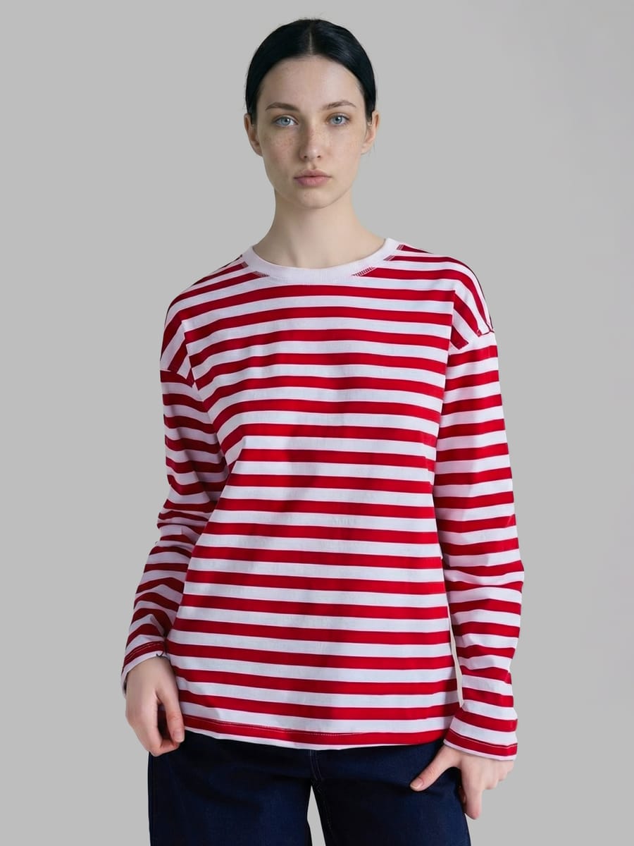 Женский лонгслив от бренда ТВОЕ в яркой красно‑белой цветовой гамме — это энергичный акцент в повседневном гардеробе, который в сезоне 2026 уверенно заявляет о себе. Полосатый рисунок придаёт модели динамичность и визуальную лёгкость, делая её заметной и при этом удивительно универсальной: такой принт органично вписывается как в расслабленные, так и в более нарядные сочетания. Оверсайз‑крой — ключевая черта этой модели. Свободная, объёмная посадка создаёт ощущение непринуждённости и комфорта, не сковывая движений. Лонгслив мягко облегает фигуру, оставляя пространство для свободы телодвижений, что особенно ценно в активном ритме городской жизни. Круглый вырез сохраняет лаконичность силуэта, подчёркивая баланс между молодёжным стилем и классической простотой.